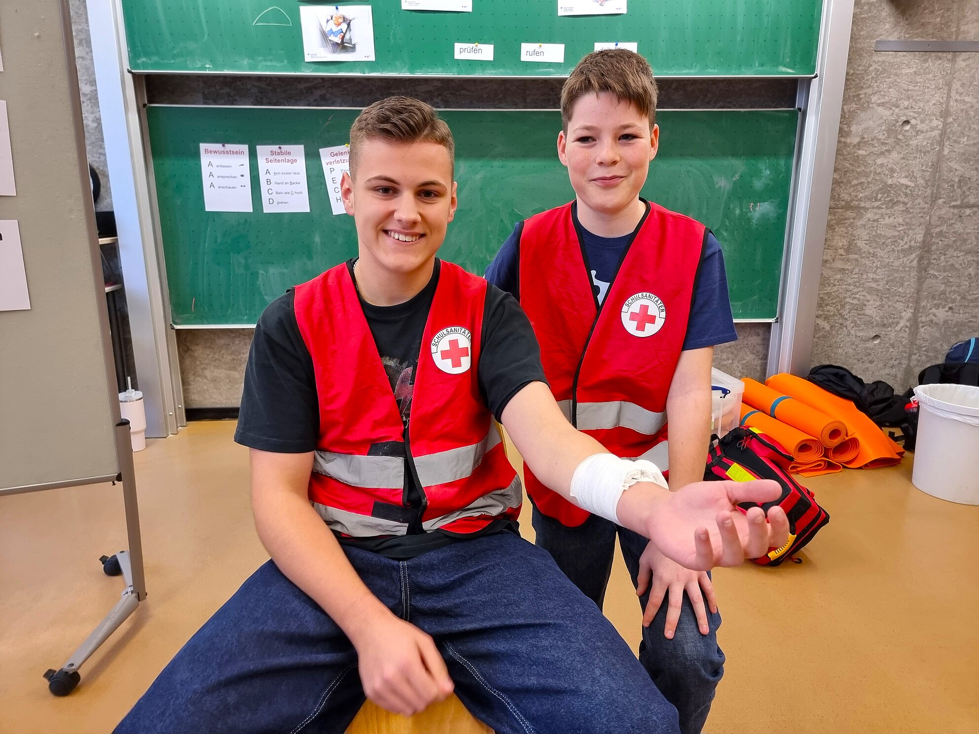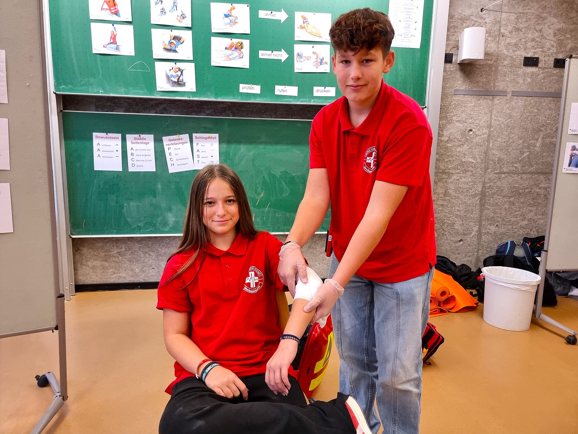 Die beiden Schüler Marlon Mayer und Leni Kilian, welche schon seit mehreren Jahren im Jugend-Rotkreuz aktiv sind, unterstützten ihre Mitschülerinnen und Mitschüler während der Gruppenarbeiten.