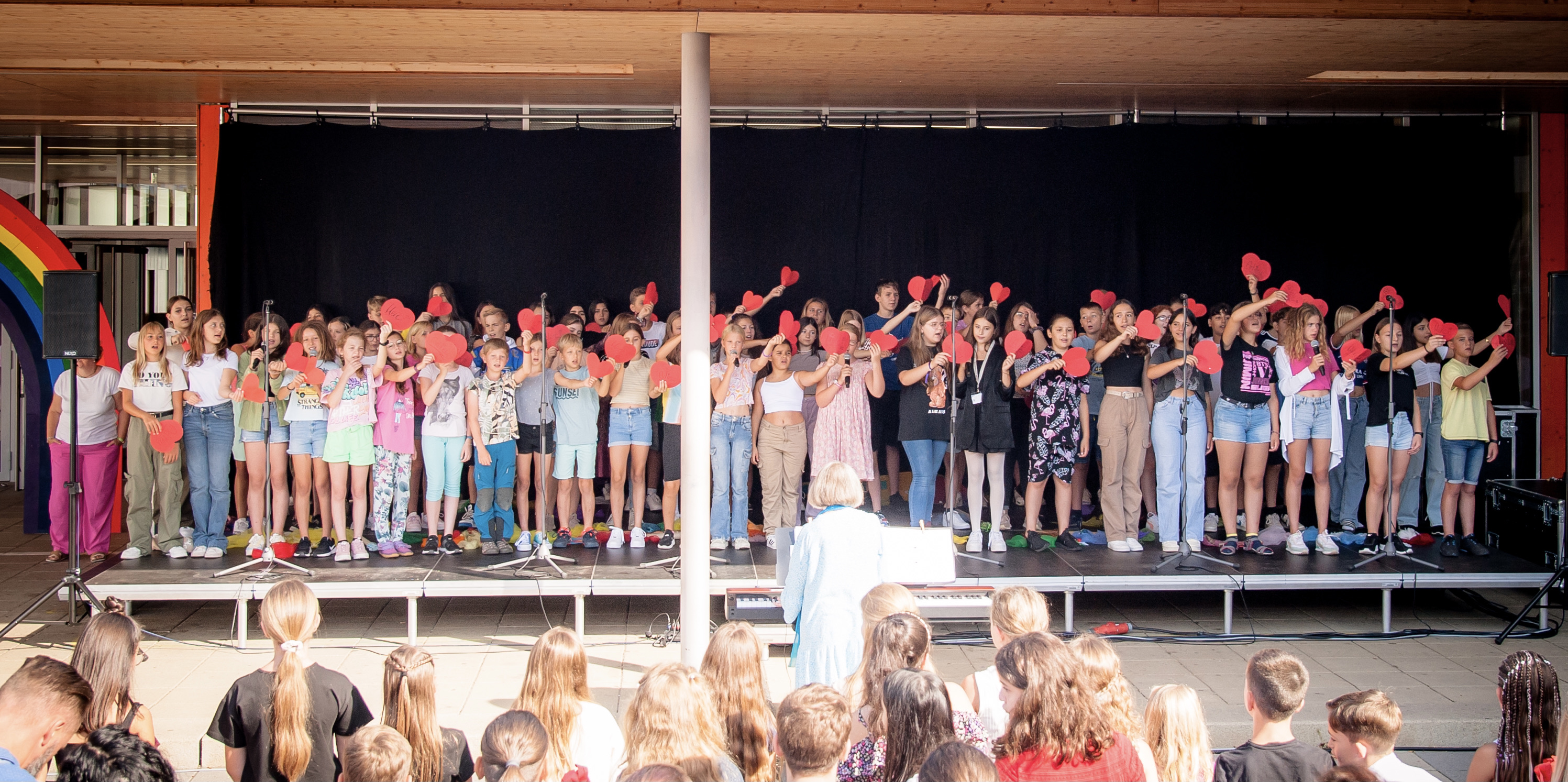 Auf dem farbenfroh dekorierten Schulhof begrüßten Schulleiterin Silke Döll sowie Konrektorin Heike Biegel und Konrektor Benjamin Exner die neuen Schülerinnen und Schüler und alle Eltern und Verwandten. Die singenden Klassen und der Chor unter der Leitung von Lehrerin Uta Albert hatten ein abwechslungsreiches, fröhliches und unterhaltsames Bühnenprogramm vorbereitet, das durch Gesang, Tanz und Gedichte einen ersten Eindruck vom Leben an unserer Schule vermittelte.